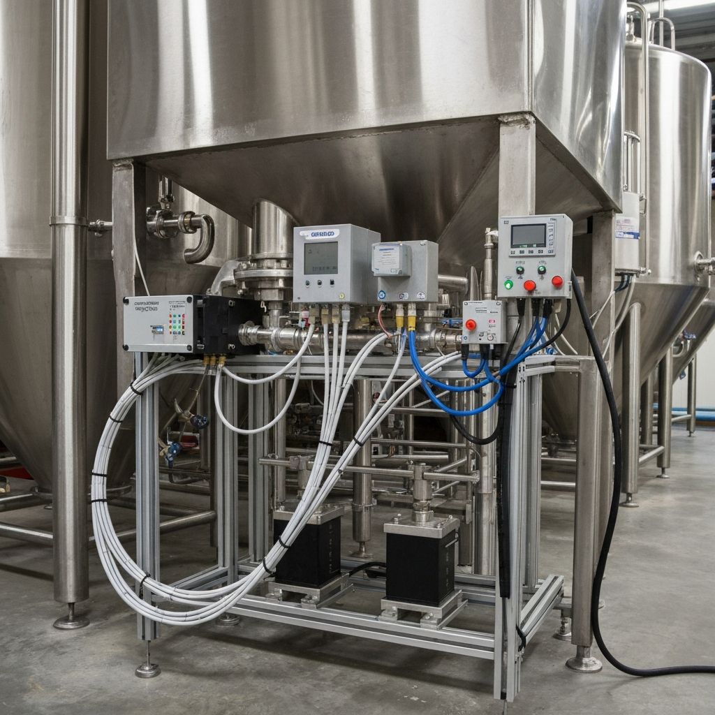 - pH-metry inline do zacierania – optymalny pH zacierania 5.2–5.5 dla aktywności enzymów. Elektrody Endress+Hauser CPS71D (hygienic design, DN25 Tri-Clamp), Mettler-Toledo InPro 3250i. Kalibracja buforami pH 4.00 i 7.00, zalecana co 2–4 tygodnie lub po każdym CIP z ługiem.