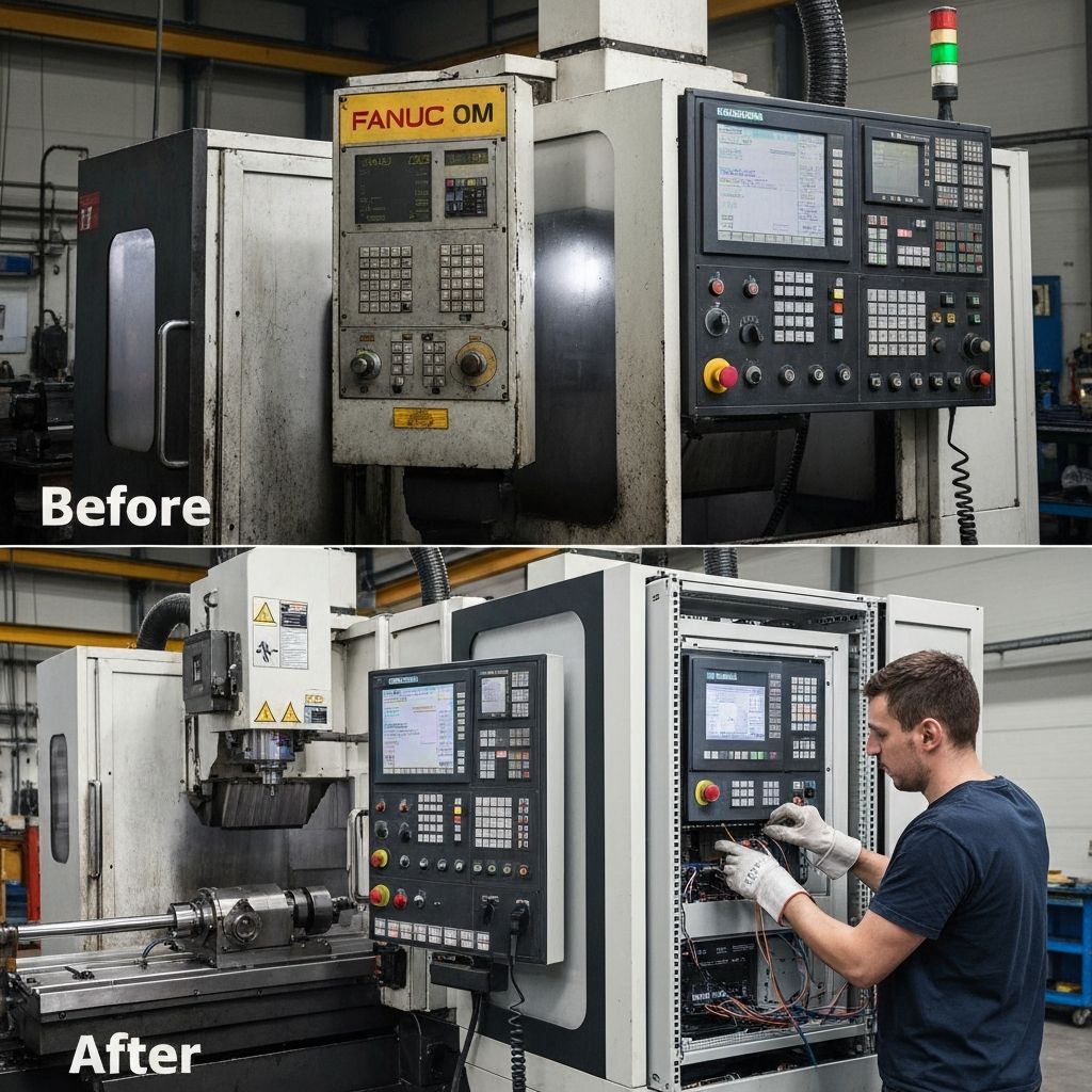 Stara frezarka lub tokarka z wycofanym sterowaniem Fanuc 0M, Sinumerik 810 czy Mitsubishi Meldas – mechanika nadal sprawna, ale elektronika nie do utrzymania, brak części, brak wsparcia producenta. Zakup nowego centrum obróbczego to wydatek 150 000–500 000 zł. Retrofit – nowe sterowanie w starej mechanice – kosztuje 35 000–150 000 zł i daje maszynę działającą jak nowa.