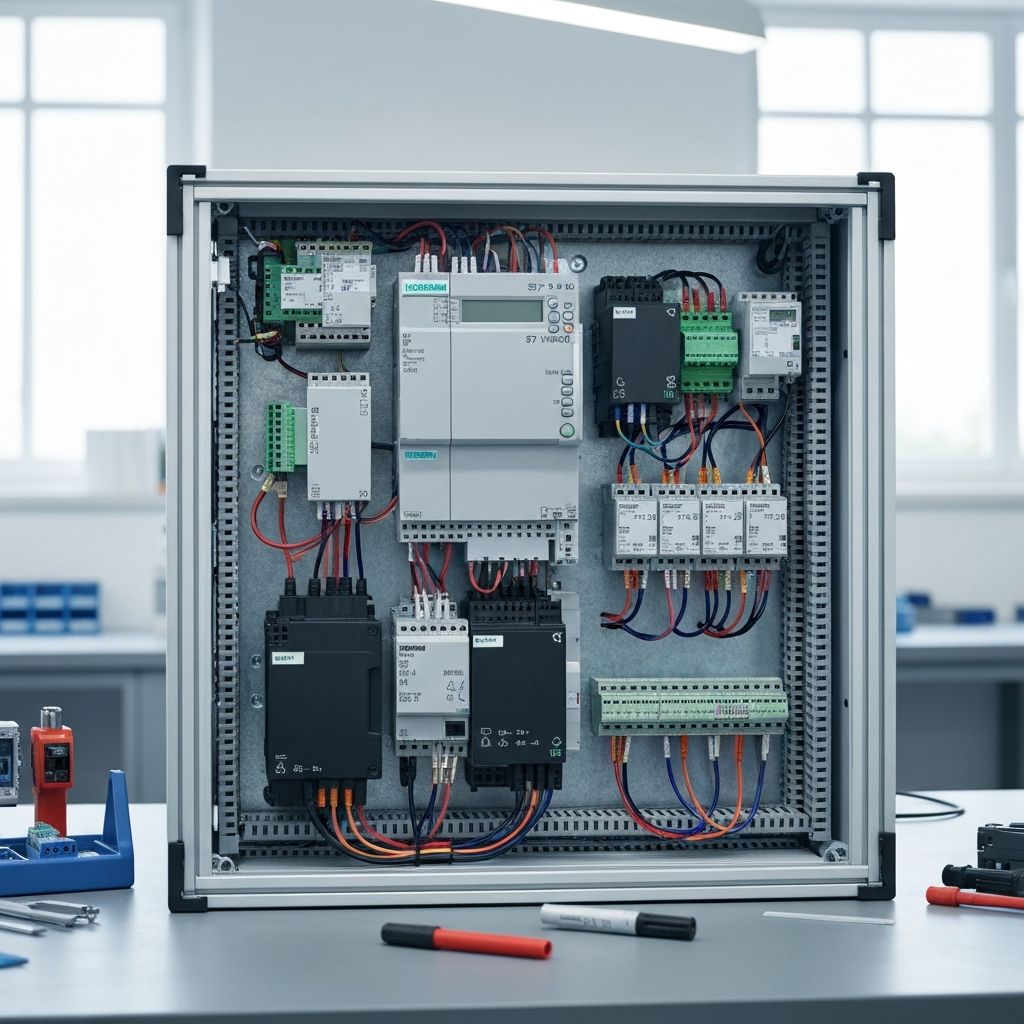 Prosta szafa sterowania z PLC, kilkoma napędami i podstawową wizualizacją. Np. sterowanie pompy, wentylacji, przenośnika.